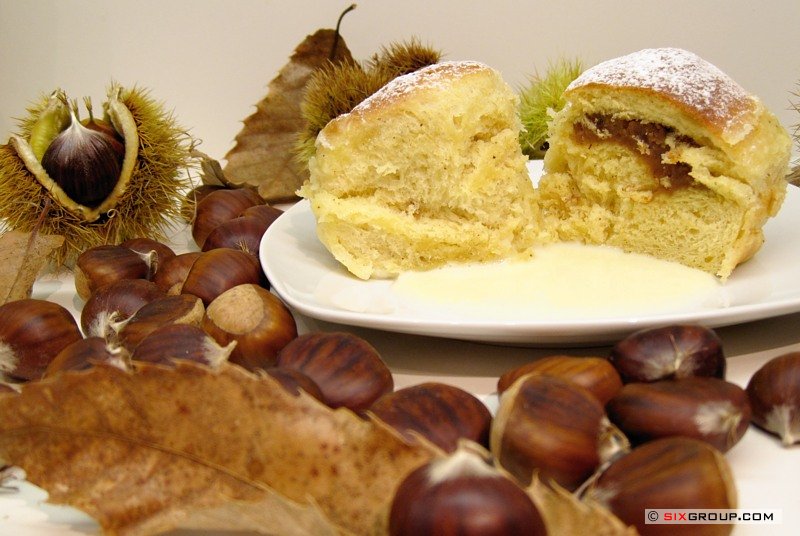 In die Mitte der Teigstücke je 1EL Kastanienpüree geben. Die Ecken übereinander schlagen, zusammendrehen und nicht zu dicht nebeneinander mit dem Schluß nach unten in eine Form setzen und nochmals 30Min. gehen lassen.