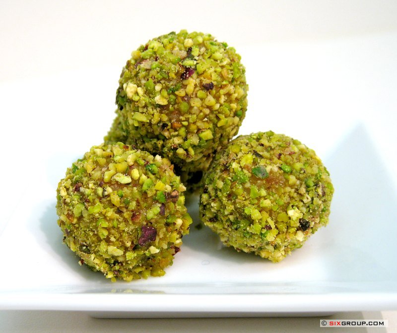 Dann aus der Masse Kugeln formen und in den Pistazien wälzen.