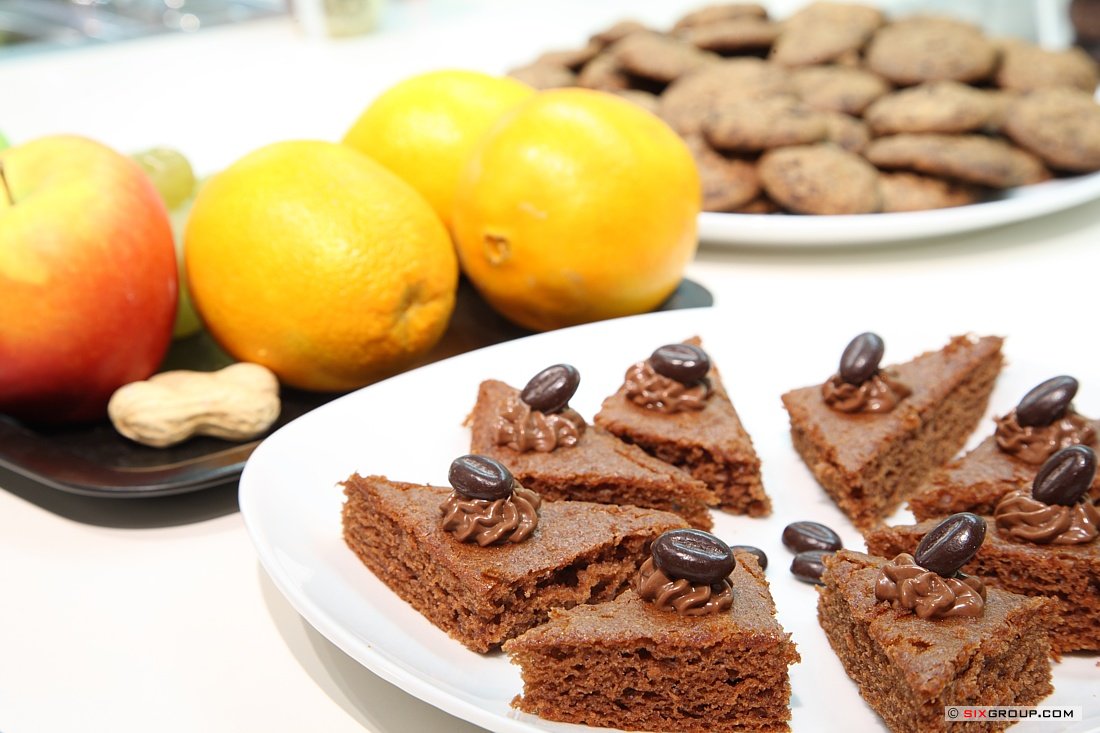 Kuchen in 5cm große Quadrate teilen, je diagonal halbieren, mit Schokocreme und Mokkabohne verzieren.