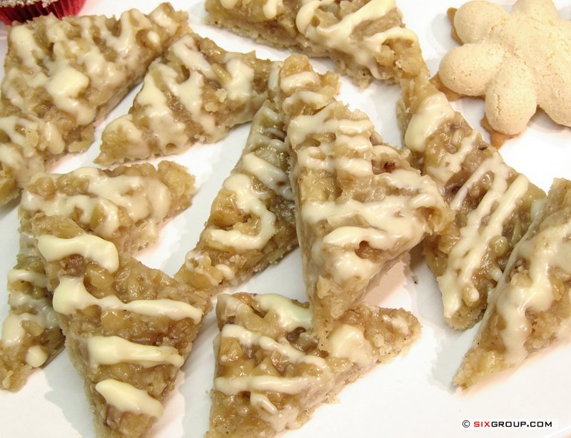 Die Nußecken direkt nach dem Backen in Dreiecke schneiden und auf dem Kuchengitter auskühlen lassen.