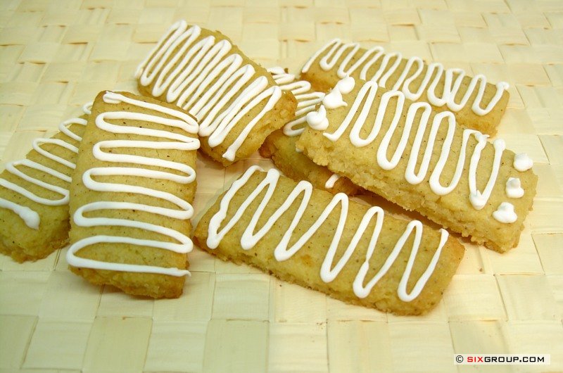 Den Teig zwischen zwei Lagen Backpapier zu einem etwa 5mm dicken Rechteck ausrollen. Mit einem Messer in 6cmx2cm lange Riegel schneiden und mit ausreichendem Abstand auf das vorbereitete Blech legen.