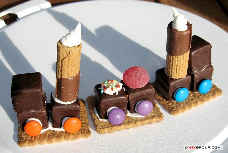 Je einen Dominostein auf einen Keks setzen, nur für die Lokomotive zwei und mit Zuckerguß fixieren. Als Schornstein dient ein Waffelröllchen. Smarties mit Zuckerguß als Räder ankleben. Den Zug nach Wunsch mit Süßigkeiten verzieren.